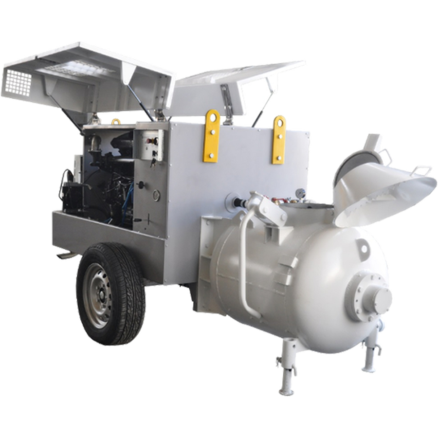 Пневмонагнетатель СО-243 комплектуется дизельным двигателем и винтовым компрессором производительностью 4,0 м. куб./мин. Это позволяет использовать данную машину как источник сжатого воздуха и подключать к ней различный пневмоинструмент. В СО-243 использован гидравлический привод бетоносмесителя.